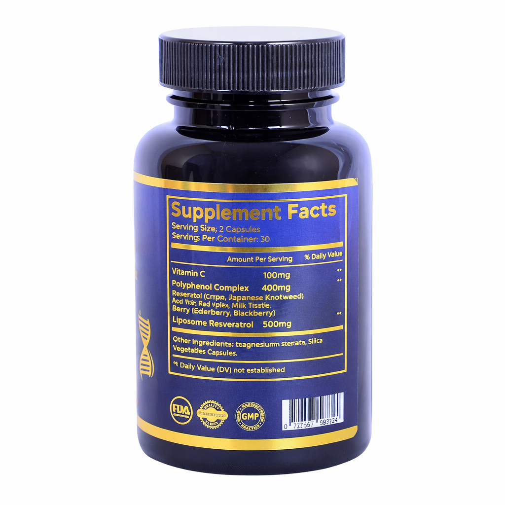 Experience the ultimate in anti-aging with our premium liposomal resveratrol. Each dose contains 1000 mg of 99% pure Resveratrol, enhanced with a Polyphenol Complex and Vitamin C. This powerful antioxidant blend promotes longevity, reverses aging, and enhances youthful vitality.