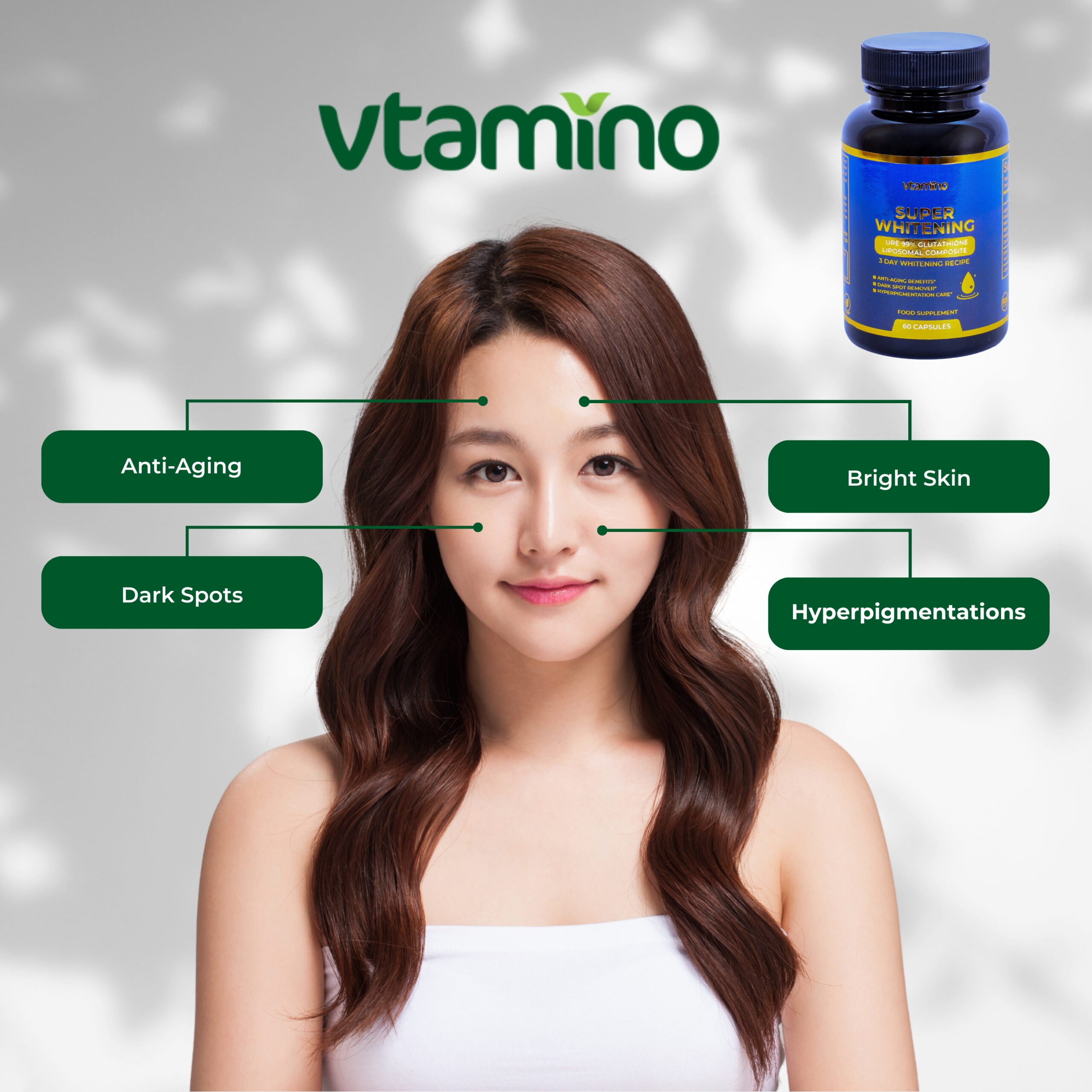 vtamino Super Whitening – PURE 99% GLUTATHIONE LIPOSOMAL COMPOSITE with Vitamin C, Collagen, Alpha lipoic acid, Grape seed extract & Cranberry extract.